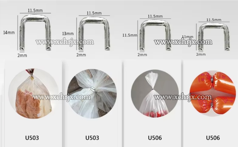Huarui sausage u clips making machine can make U shaped clip: 501 502 503 504 506 508 201 202 711 801 802 805 808 810 S 735 S 740 100 T 121 T 201 T 211 T 101 102 500 700 K 76 K 78 50 S 90 S 100 S 110 S U 2 U 3 U 50 U 60 U 70 B 1 B 2 735 740. The clips are matched with manual or automatic clipping machine. Each technical data can reach international standard.
