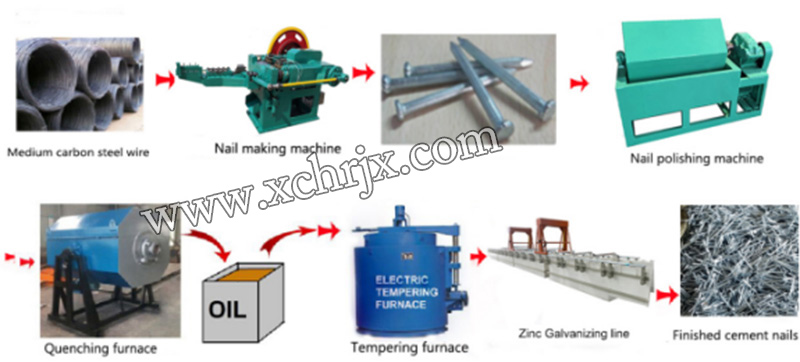 Wire material--Nail making machine --nail polishing machine --nail hardening furnace --nail tempering furnace --nail zinc galvanizing equipment --Finished cement nails .